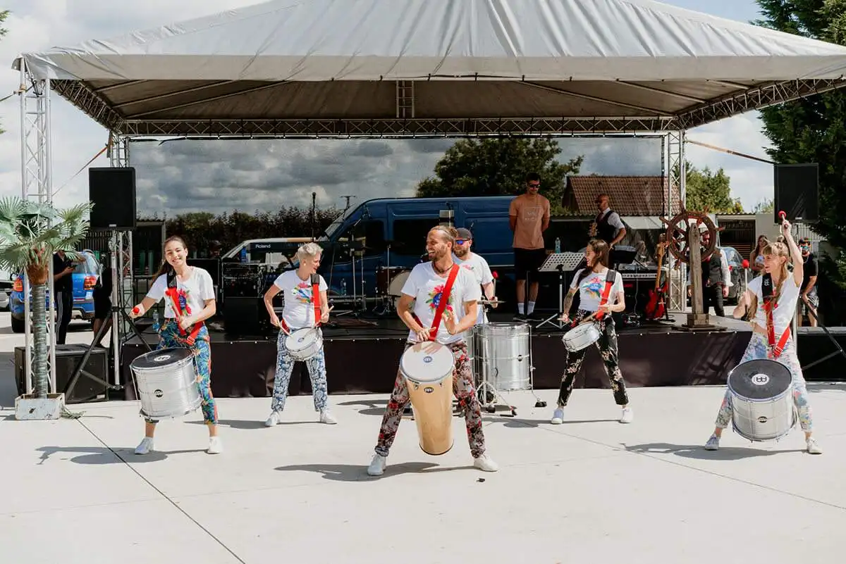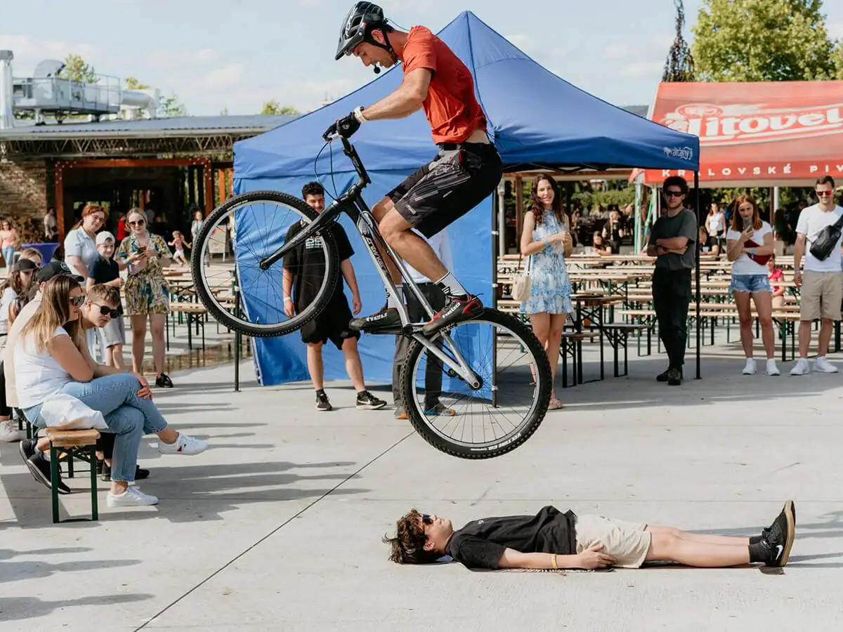 Ale ani na hlavním pódiu nebylo prázdno. Celým odpolednem provázel zkušený moderátor, který také předvedl dechberoucí cyklotrialovou show, do které zapojil i diváky. Ale uvedl i kouzelníka, slavnostní krájení dortu k výročí otevření pobočky, bubenickou show a také kapelu, která svou hudbou skvěle dokreslila atmosféru uvolněného letního odpoledne. Samozřejmě nechyběl bohatý catering a odpočinkové zóny, takže rodinné zábavné odpoledne si mohl užít úplně každý.